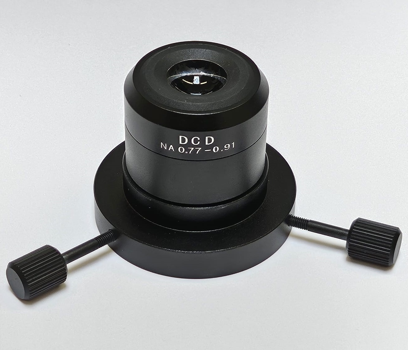 Abbe Dunkelfeld-Kondensor mit Zentralblende (N.A. 0,77-0,91) für Dunkelfeldbeobachtung bis max. 60x Objektiv. Dieser Kondensor arbeitet trocken, er wird also ohne Immersionsöl verwendet!
