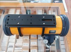 Der Okularauszug ist ein stabiler Zahn-/Trieb-Auszug, der an der Basis voll rotierbar ist und mit dem Mikrofokus MEF-3 nachgerüstet werden kann und soll, bei so lichtstarken Geräten ist natürlich eine genaue Fokussierung besonders wichtig, wir bieten aber auch einen passenden Adapter für unseren Lacerta MFOC-Motorfokus an. Der zweilinsige Korrektor ist im Okularauszug verschraubt, Adapter auf 1,25“ gehören zum Lieferumfang. Der Tubus ist extrem massiv, das Rohr besteht aus mehrere mm dicken Aluminium, die Schrauben hinten bei der Hauptspiegelzelle sind alle versenkt, der Tubus kann daher auch aufrecht abgestellt werden.
