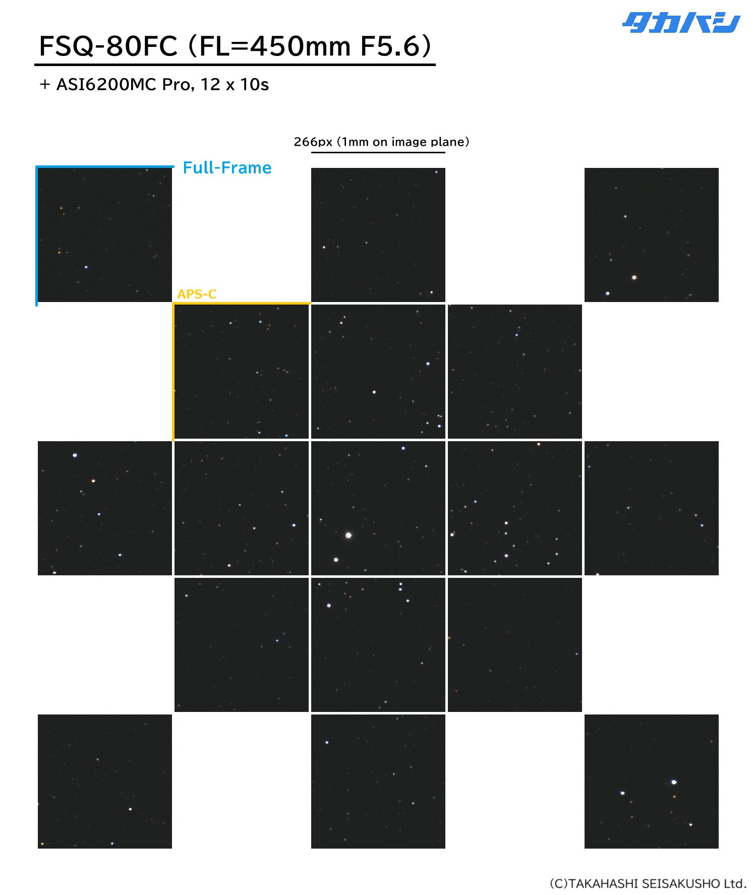Der Tubus ist, abgesehen vom Innenleben, mit dem des FSQ-85 weitgehend baugleich, es können die bisherigen Schellen verwendet werden, auch der Okularauszug ist der selbe. Der Reducer des FSQ-85 ist für den FSQ-80FC nicht geeignet, Takahashi wird in Zukunft aber einen passenden Reducer anbieten. Das große, ebene Bildfeld gepaart mit feiner Sternabbildung ist natürlich auch visuell ein Genuss, eine 2" Okularklemme ist jedoch nicht enthalten und muss gesondert bestellt werden (TKP27110S).