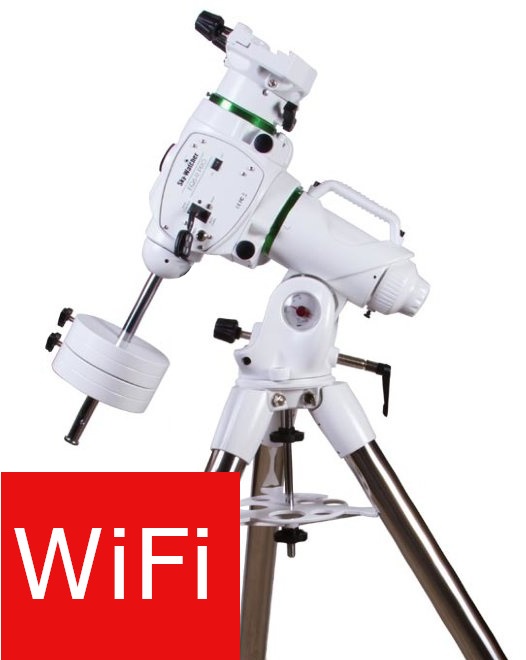 Die Montierung selbst hat, in vorgespannten Wälzlagern gelagerte Stahlachsen. Sie läuft gleichmäßig, hat geringstes Schneckenspiel in RA und DEC Achse und ist vor allem sehr steif. Dementsprechend erhöht sich die Tragefähigkeit. Die empfindlichen Teile sind im Kopf fest eingehaust, gut geschützt vor Staub, Feuschtigkeit und Tau. DasTripod hat 45mm dicke Stahlbeine, welche von unten mit einer Platte gegen gespreizt werden können: Höhere Stabilität und Ablageplatz für Okulare in einem. Das Polarscope hat die neue Strichplatte mit Präzessions korrigierter Skala.