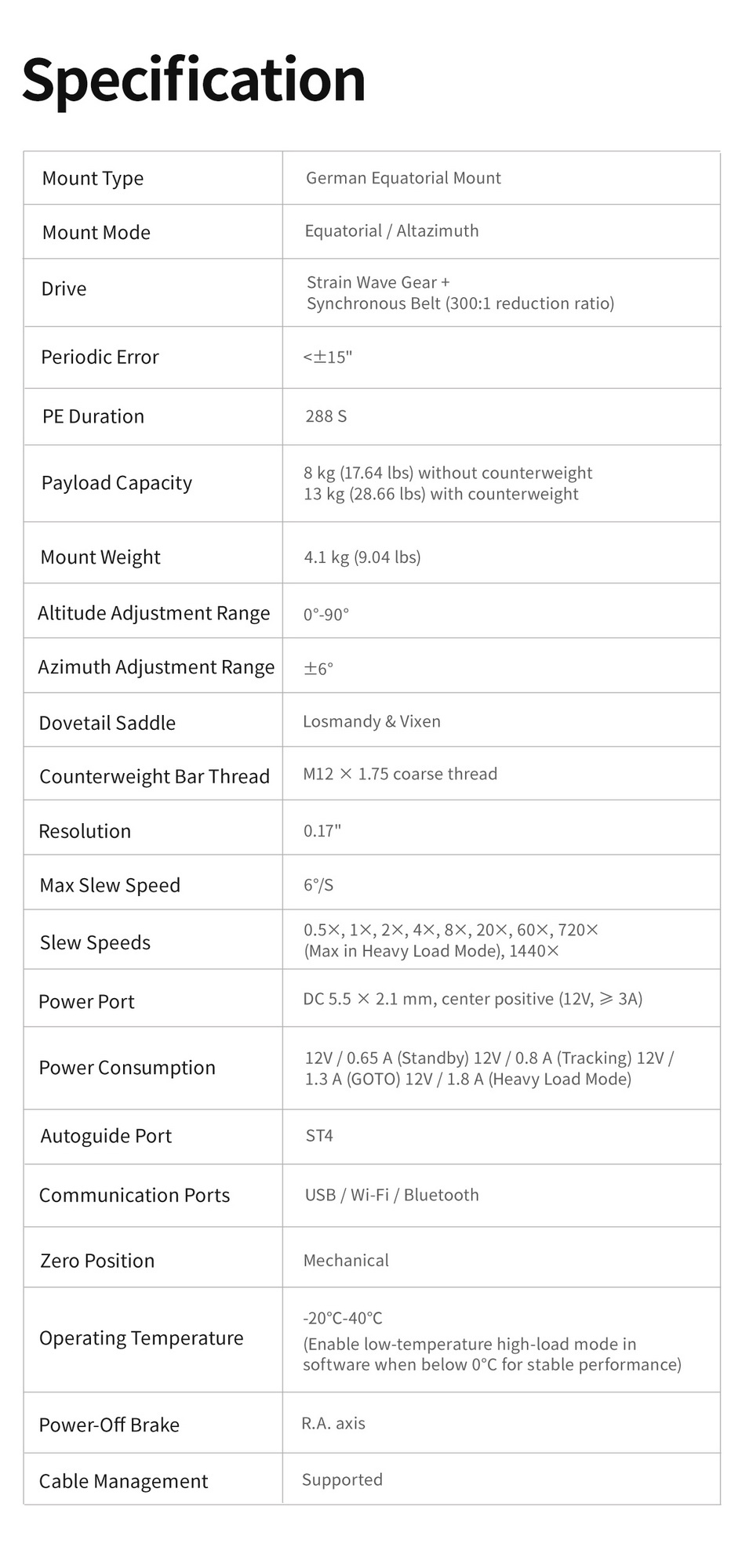 Der Montierungskopf wiegt nur 4,1 kg, das optionale TC40 Carbon-Stativ wiegt 2,3 kg. Die Tragkraft beträgt 8 kg ohne Gegengewicht und bis zu 13 kg mit Gegengewicht. Dies macht die AM3 zu einer exzellenten Reisemontierung, da sie aufgrund ihrer kompakten Maße ultra-portabel ist und dennoch die meisten gängigen Teleskope präzise bewegt.
