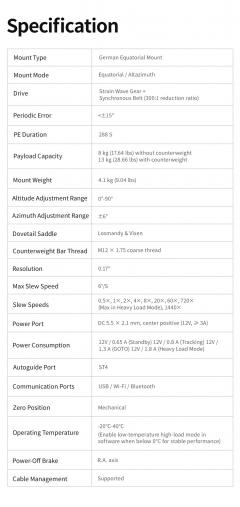 • Heavy Load Mode (in der App): Ermöglicht eine höhere Zuladung und schnellere GoTo-Geschwindigkeiten.